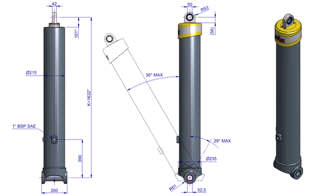 Цилиндры FEE отличаются соединением пальцевого типа. Такой способ соединения обеспечивает удобство монтажа и сопротивление боковой нагрузке при рабочем давлении, повышенном до 250 бар. В стандартную линейку входят цилиндры с диаметром первой ступени от 110 до 226 и рабочим ходом от 2785 до 9030.